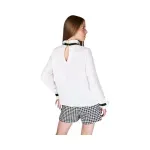 •Blusa elegante con volantes. •Mangas abullonadas con puño ajustado. •Detalles en contraste color negro. •Cuello redondo con acabado delicado. •Corte recto y favorecedor. •Color: Crudo.